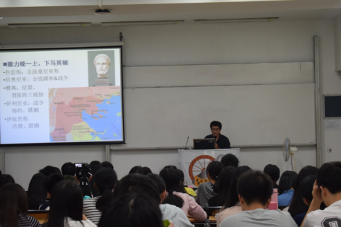 王三三老师从亚历山大的名声说起,继而进入此次论坛的主要内容:亚历山大东侵的历史背景;亚历山大及其少年时代;亚历山大东侵的历史经过。在讲述的过程中,王三三老师紧密结合文献资料,配以地图图表,对于一些有争议的问题也陈列出几种不同的观点,带领同学们进行分析。到了提问环节,气氛活跃,同学们积极举手,提出自己的疑惑,在与老师的对话中,对问题的了解不断深入。